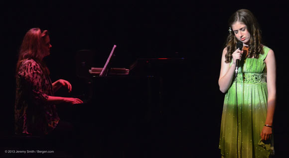 Brigid takes a break from performing to help Broadway Director and Skyline Theatre's Artistic Director Sam Scalamoni, and Broadway and TV star Brian d'Arcy James, announce the winners of the evening's silent auction. Click here to read more about the benefit concert.